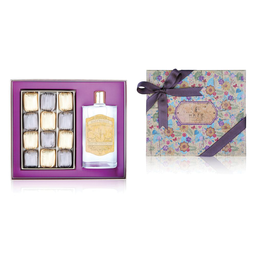 • 12 adet sütlü – bitter çikolata kaplı folyo sargılı fıstık krokan ve kolonya